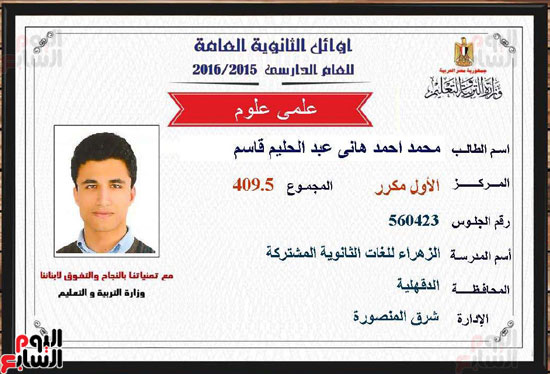 قائمة المتفوقين أوائل الثانوية العامة 2016 اليوم السابع