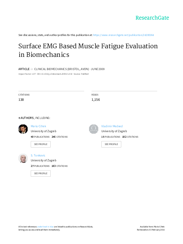 Pdf Surface Emg Based Muscle Fatigue Evaluation In Biomechanics Vladimir Medved S Tonkovic And Mario Cifrek Academia Edu